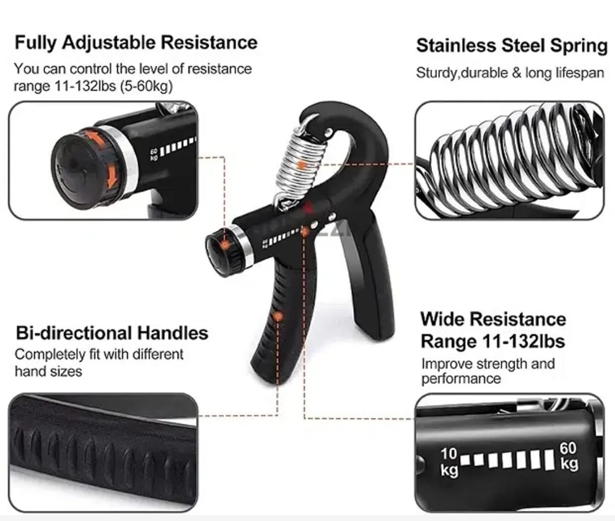 ✔ Ajustable Hand Gripper → Grip ajustable con niveles de resistencia de 10 kg a 60 kg.
