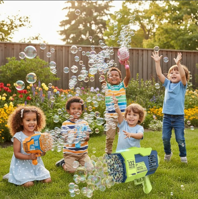 Con el Lanzador de Burbujas Automático de 132 orificios, crea cientos de burbujas por segundo y transforma cualquier momento en una fiesta llena de color y alegría 🎈